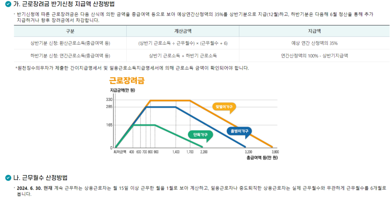 반기 신청 시에도 연간 소득 기준이 적용되지만, 신청 시점에서는 상반기 또는 하반기 소득만을 기준으로 장려금을 계산합니다.